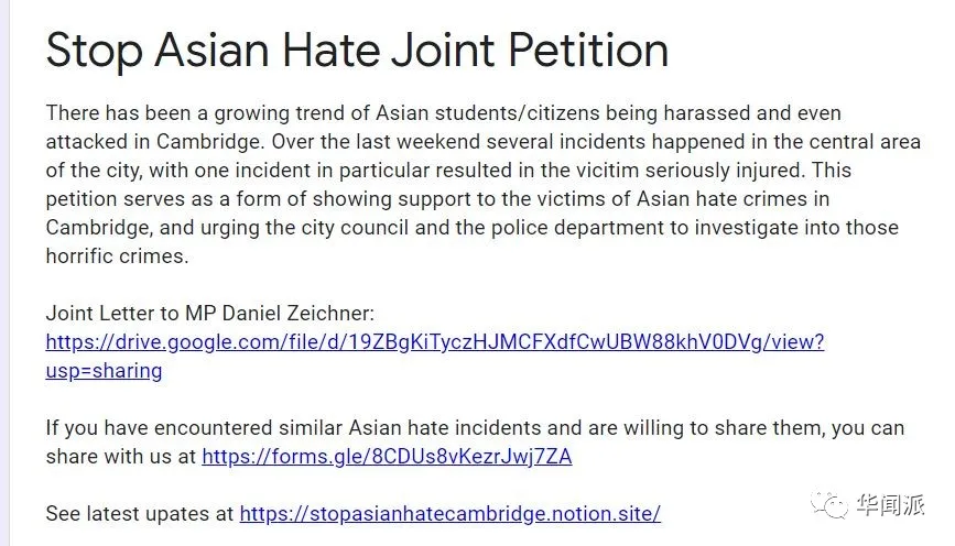 得知此事後,劍橋華人紛紛表示震驚和憤慨。受Zhang先生委託,當地華人最大的公益組織——劍橋華人中心在網上發起了“停止對亞裔的仇恨”(Stop Asian Hate)請願簽名活動,目前已經收集了上千個簽名。