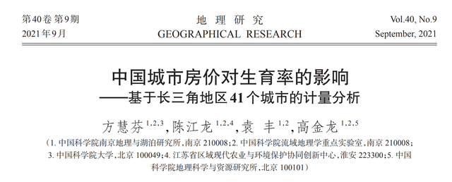 這篇論文題目為《中國城市房價對生育率的影響——基於長三角41個城市的計量分析》,作者是方慧芬、陳江龍、袁豐和高金龍,出版在2021年9月的《地理研究》期刊上。論文研究了長三角41個城市(上海市、江蘇省、浙江省、安徽省)2008-2018年的房價、生育率數據。
