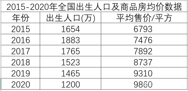 下表為2015-2020年我國出生人口及商品房均價數據,數據來自國家統計局。2016年放開全面二孩,當年出生人口迅速上漲至1883萬。此後,出生人口隨着商品房均價的不斷上漲而不斷下跌。