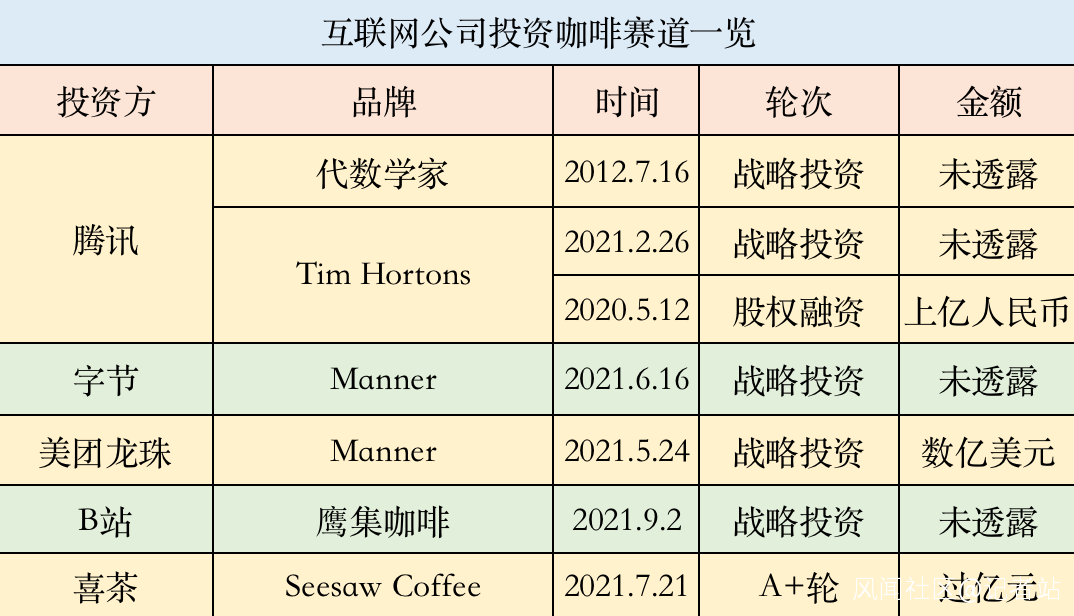 互聯網公司也紛紛在咖啡賽道下注。半年間,騰訊、美團龍珠、字節、B站、喜茶等先後投資咖啡新貴。