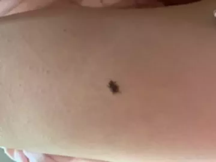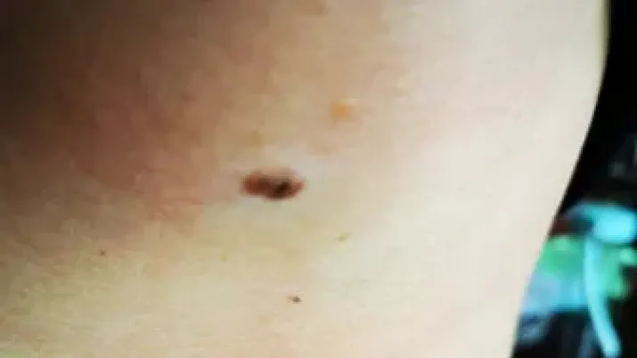 50歲,女,位於左側乳房下面,胸罩下邊緣的位置,直徑7毫米左右,棕色,顏色不均勻。