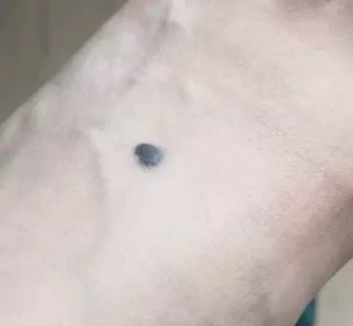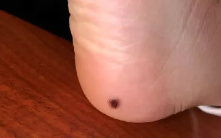 女,37歲,左腳腳背六七年前長了一顆痣,短時間內長大比較快,然後就沒再長了。凸起,顏色黑藍色,不痛不癢。