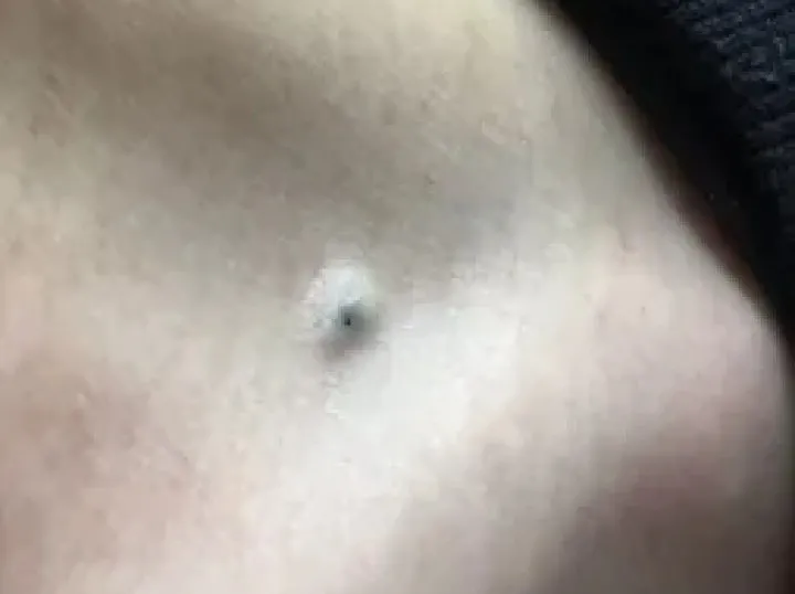 女,41歲,痣長在左肩鎖骨上方。正常情況下微高於皮膚,捏起來看直徑大約4~5毫米,摸起來有一個包塊。這幾年大了一點。表面有個小口子,以前看到裏面有黑色東西,用手擠過,有東西出來。