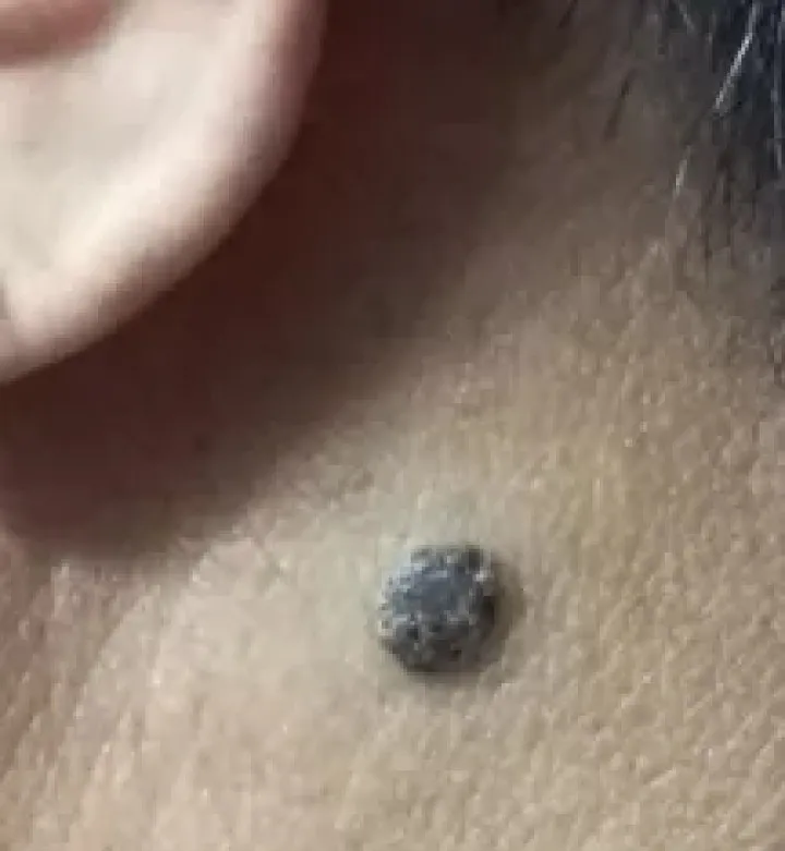 男,79歲,痣黑色,直徑約6~7毫米,表面稍有凸起且偏硬,位於頸部左耳斜後下方約2釐米處。已有很多年,自己無感覺,近來偶有癢感,但自覺無其他症狀。