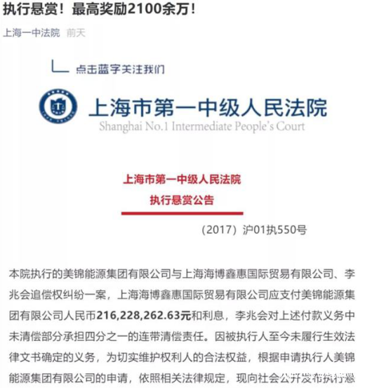 通告由上海市第一中級人民法院發佈,顯示山西前首富李兆會為執行人,對於提供線索併成功找到李兆會的舉報人,美錦能源將獎勵10萬元,提供可執行財產線索按實際執行到位金額給予10%的獎勵,最高可達2100萬。