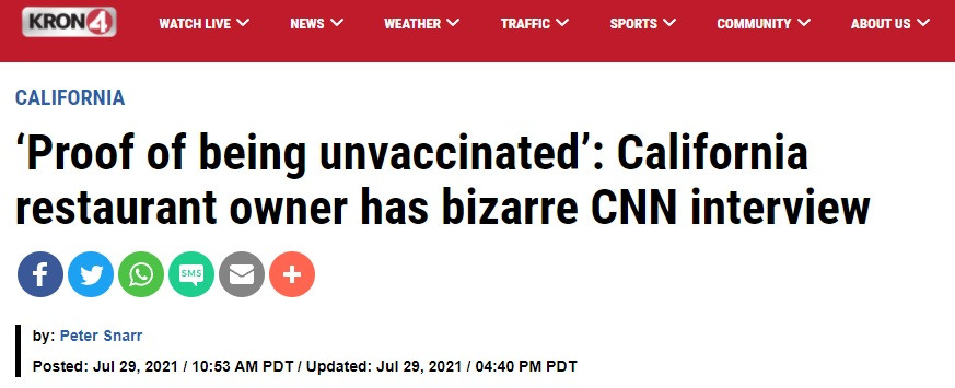 《KRON4》: 一位南加州餐館老闆最近因發佈其公司不歡迎接種疫苗的顧客而走紅,他接受了 CNN 的 Chris Cuomo 進行了一次奇怪的採訪。