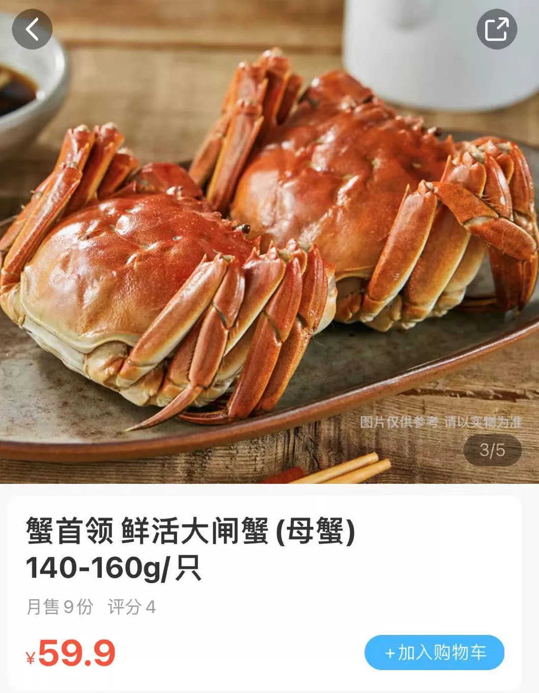 小鵬問我城裏的大閘蟹都賣多少錢?我上盒馬生鮮上看了,一共兩款大閘蟹,截圖給小鵬。