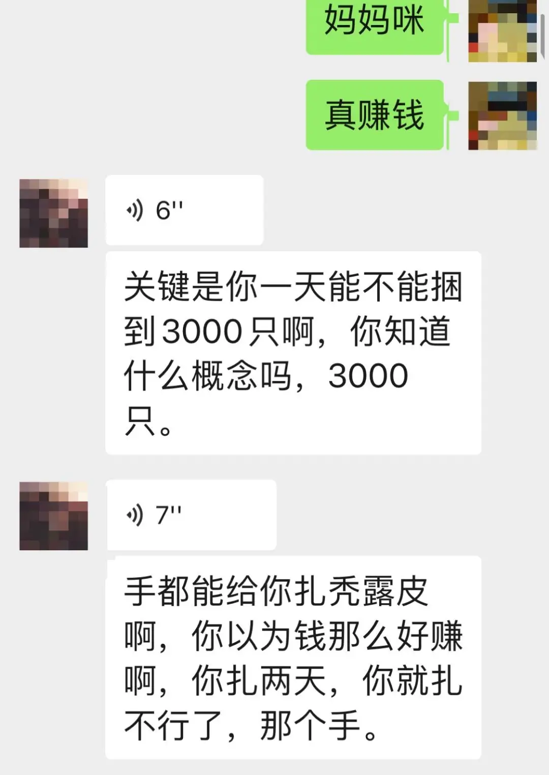 算完賬後我激動了,但小鵬卻説,關鍵你一天能綁3000只嗎?手給你扎禿嚕皮!