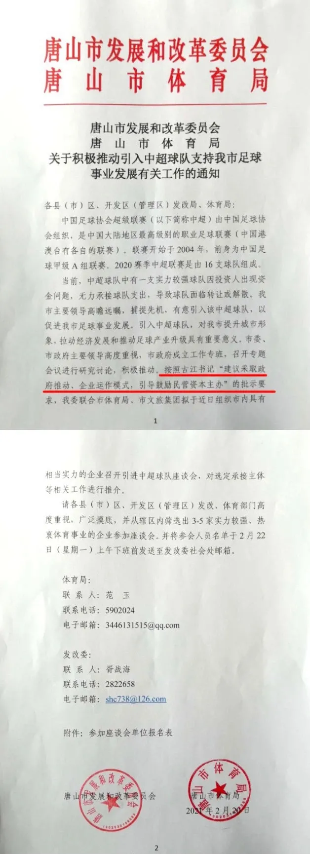2月份時,唐山市委市政府攜本地大型國企唐山市文旅集團接觸河北隊的身影越來越頻繁,當時有一則衙內文件在燕趙大地瘋狂傳開。