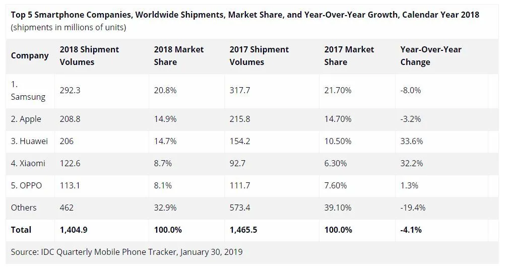 2015年餘承東曾經豪言“三年超蘋果,五年超三星”,2018年是第三年,華為第二季度、第三季度的出貨量都高於蘋果,全年出貨量和蘋果只差了不到300萬部,他們幾乎就做到了。
