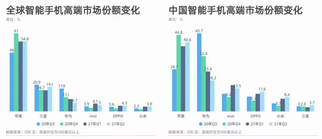 根據第三方研究機構GfK的數據,全球500美元以上的高端市場中,蘋果市佔率由去年三季度的46%增至今年二季度的54.8%,而另一家主打高端的三星佔比則基本沒有變化,維持在20%左右。中國高端市場蘋果的份額則從從去年三季度的24.7%增至到了今年二季度的40.6%——這部分份額基本全部來自於華為的缺位。