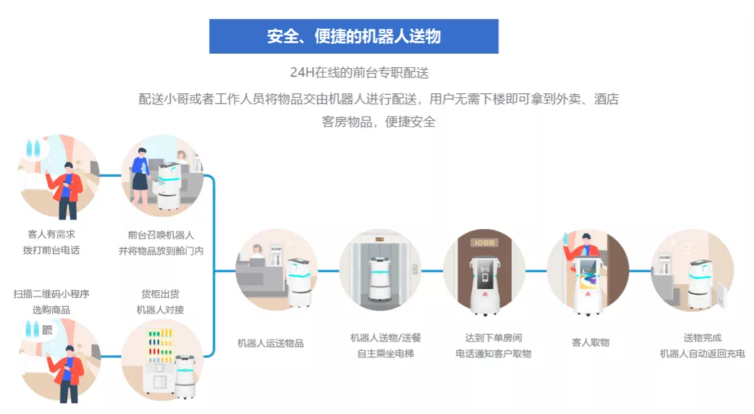 與優小弟相似,智慧酒店服務機器人優小妹能實現自主送物、客户引領、迎賓接待、信息宣傳等功能,新一代優小妹體積變小、負重能力增大、智能化能力提升。而且,優小妹並不是作為單一的送物機器人而存在的,服務機器人廠商傾向於給出一套智能化解決方案,打通從購物到送貨上房間的全鏈路,可匹配商城客需小程序和智能貨櫃。這套組合拳不僅在服務上更好地滿足了住店客人的需求,也讓酒店管理者捕捉、沉澱了以往缺失的數據,為運營決策提供更科學的依據。