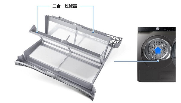 在乾衣機自身清潔方面,三星智愛·呵護系列乾衣機搭載了二合一過濾器,配備雙層濾網,能有效捕捉灰塵和絨毛,快速打理乾衣機內部贓物,避免灰塵等堆積。