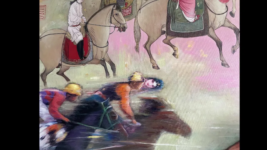 而我畫的這幅畫下面則是當代的一羣騎手,如旋風般衝進畫面,你追我趕,由於速度太快,甚至看不清騎手的臉,古人的慢和今人的快,並置在畫面上。