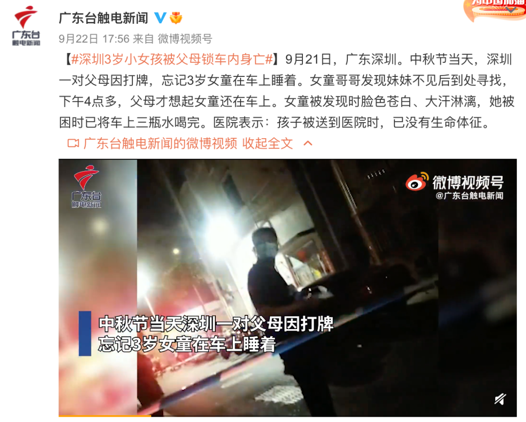 中秋節當天,深圳一名3歲女童被鎖車內近3小時,被發現送到醫院時,已沒有了生命體徵。
