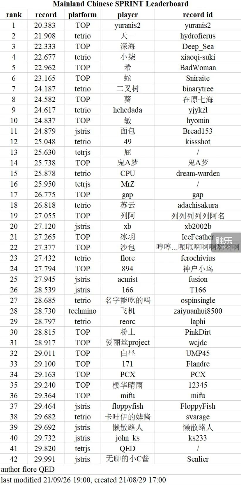 flore統計的中國大陸地區玩家競速成績。參與統計排名的有多個版本的“俄羅斯方塊”,不過規則類似