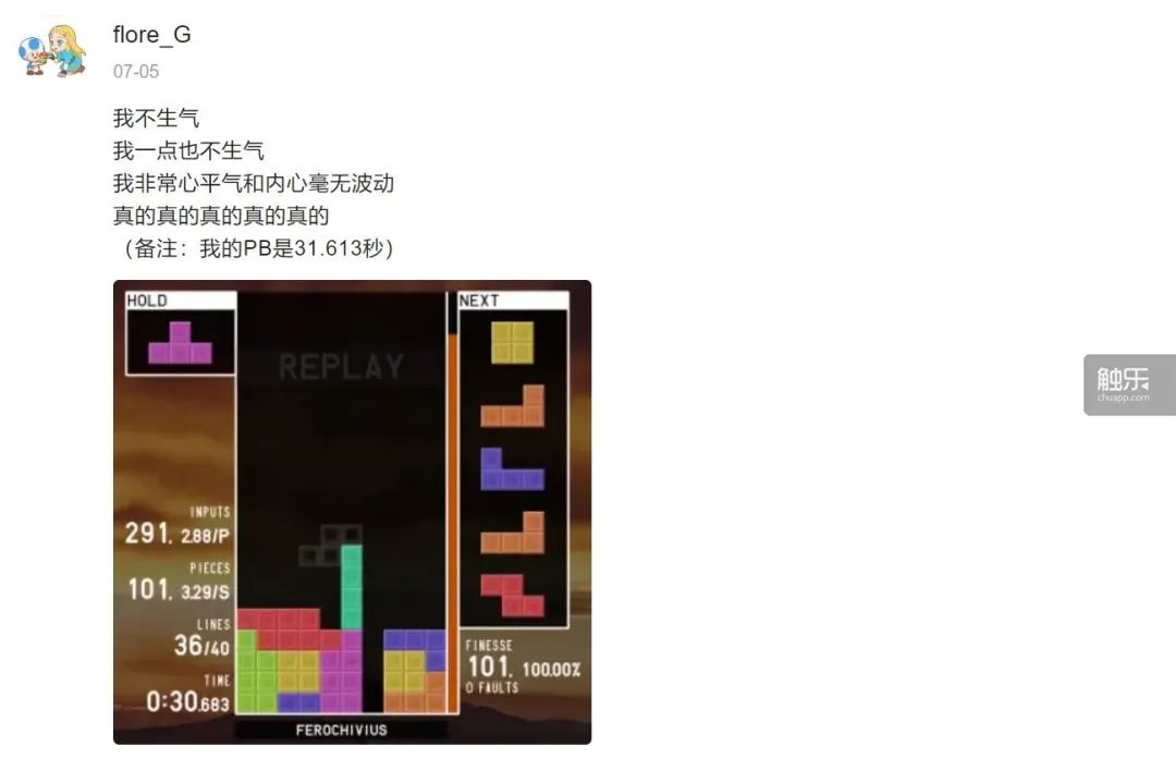 最難受的一次是距成功最近的一次。兩個月前,flore癱在椅子上,寫了一條動態。“我不生氣,我一點也不生氣,非常心平氣和,內心毫無波動。”他強調,“真的真的真的(不生氣)。”文字下面是一張遊戲截圖,畫面的兩邊分別疊起了4層方塊,豎着放置一根“棍子”就能消除。計數器顯示這是最後4行,時間是30.683秒,如果不出意外,這局將夠突破他的個人紀錄,縮短最佳成績近1秒。