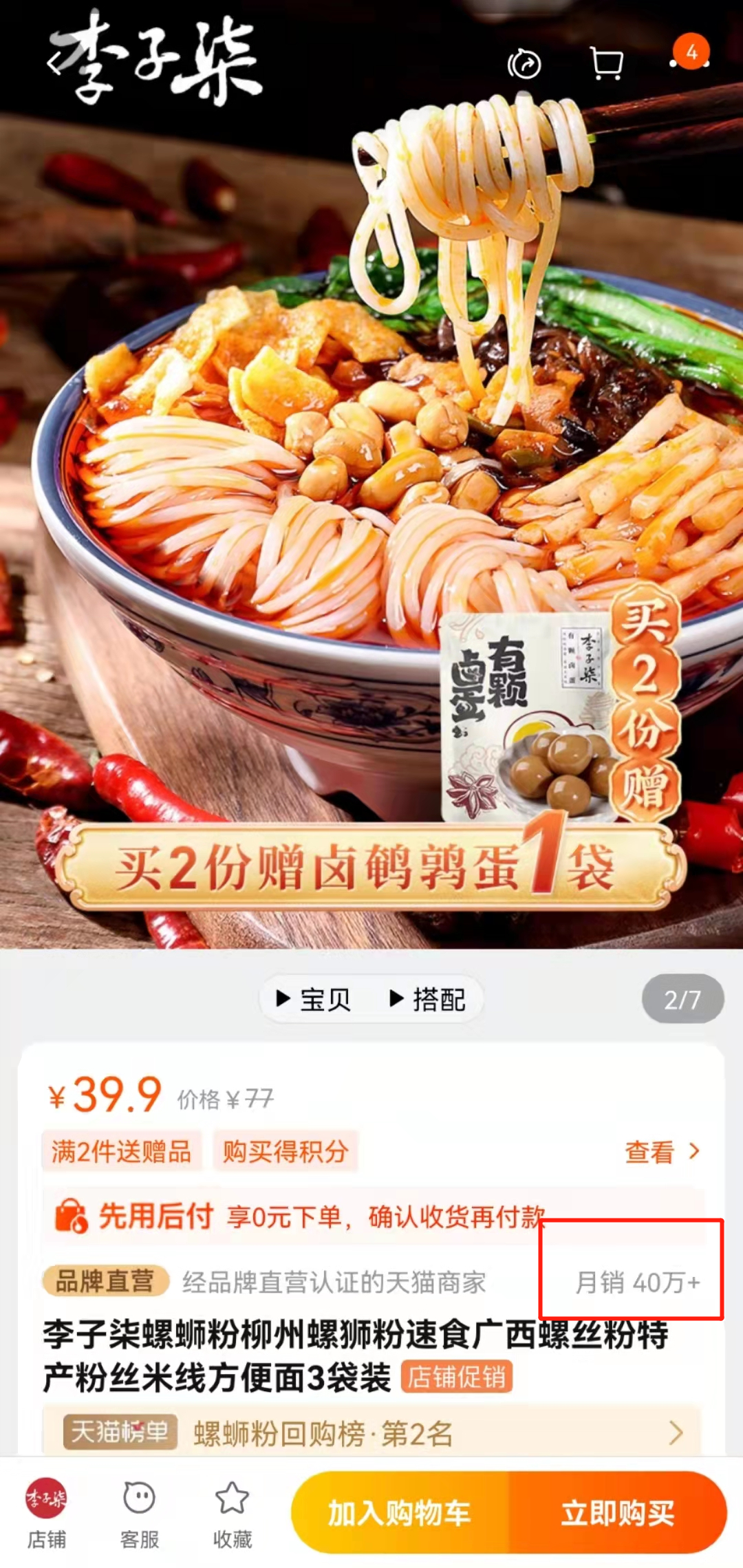 而這份商業價值在2018年終於被具體化,微念在這一年推出了“李子柒”品牌,旗下先後推出了藕粉、柳州螺螄粉、鮮花餅、綿陽米粉等產品。據淘寶旗艦店顯示,“李子柒螺螄粉”的月銷售量已達到40萬+,銷售額在1596萬/月。