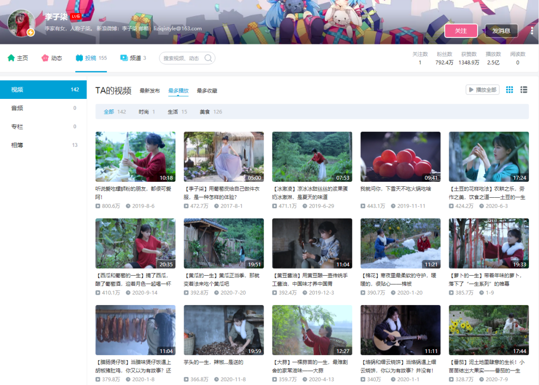 但當時的李子柒並不會預料到這些,她依然在挖空心思鑽研着內容創作。到目前為止,她在五年內製作了155支視頻,平均每支視頻的全網播放量基本都在千萬級別。