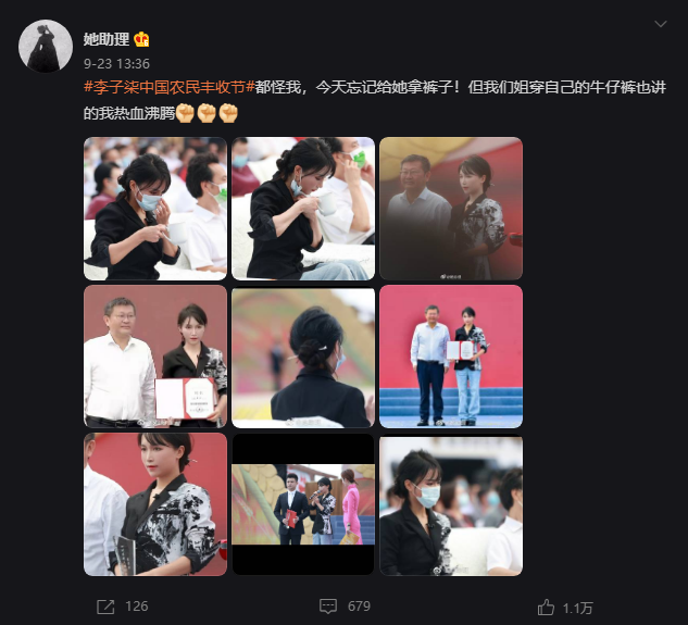 直到9月23日,線上消失多日的李子柒來到了2021年中國那農民豐收節活動現場,被聘請為四川農耕文化形象大使。她的助理發佈了幾張她在活動現場的照片,算是再次“報平安”。