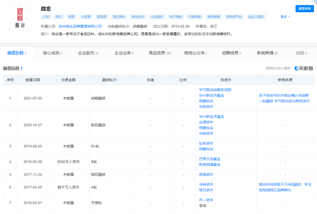 據天眼查顯示,就在李子柒停更的前幾天,7月3日,字節跳動、華興新經濟基金、琮碧秋實、華映資本四家資本方入資了微念科技,這無疑體現了資本市場對李子柒價值的高度看好。