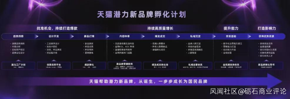 在雙輪驅動下,一個品牌要實現從0到1的突破,天貓能為它做什麼呢?第一,創業者可根據天貓行業發佈的趨勢、發現的機會,選擇賽道;第二,天貓新品創新中心(TMIC)為產品研發提供智能測款,以提高命中率;第三,產品研發出來之後,犀牛智造實現“小單快反”,即產即銷;第四,天貓U先、天貓小黑盒推小樣派發、新品上市,讓新品出街即成爆品;第五,用户運營,包括站外的小紅書、抖音、B站、知乎、逛逛等實現內容觸達,天貓官方旗艦店則負責人羣運營,實現公域、私域的聯動融合互通;第六,以營銷加持和成交爆發打造爆款;第七,Alibaba Deign助VI定位、工業設計及通過阿里魚、IP mart實現IP授權、品牌煥新來實現品牌升級。除此以外,天貓還有一系列平台工具,幫品牌實現數智化經營,並開放接入外部生態夥伴,實現更專業的服務,如數據分析ISV、內容營銷MCN、品牌管理公司等。