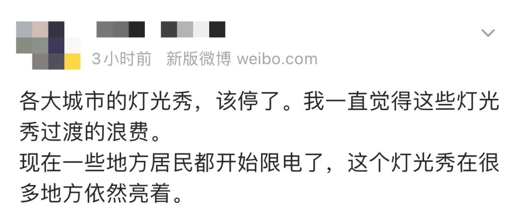 同樣是幾天前,隨着哈爾濱多家商場因限電宣佈閉店時間提前的消息衝上微博熱搜,不少人提出質疑,一邊是東北三省因電力供應不足而造成的限電,一邊卻是多個城市大面積、長時間的燈光秀所帶來的用電。隨着越來越多省市被捲入“限電潮”當中,燈光秀是否需要先停一停?