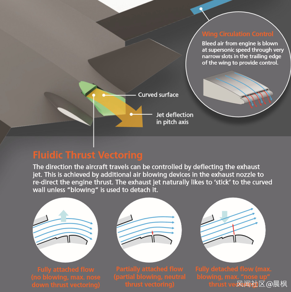 流體控制是用射流改變固定翼面上的流動走向的新方法,通過引射來實現氣動控制。這確實是更先進的方法,還在研究之中,英國BAe已經推出MAGMA無人機,用於研究流體控制問題。