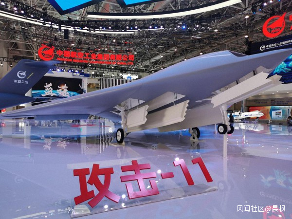 但攻擊-11採用的還是常規的氣動控制面,沒有采用流體控制。中航大概聽到了有關傳説,特地在珠海闢謠,把模型上的氣動控制面轉一個角度,讓人們看個真切。一般航展模型還不費這個事,翼面都是在中立位置的。