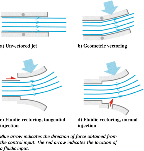 BAe的方法是發動機噴流的外流動轉向,射流方法也可以用於發動機噴流的內流動轉向控制。既可以沿切向注入高速流動,把噴流向壁面吸引(c);也可以用更加簡單粗暴的沿軸向注入高壓氣流,把主噴流向既定的方向推轉(d)。(a)為無偏轉噴流,(b)為用導管偏轉形成的推力轉向,這是當前的主流方法,差別只是如何形成導管的偏轉。