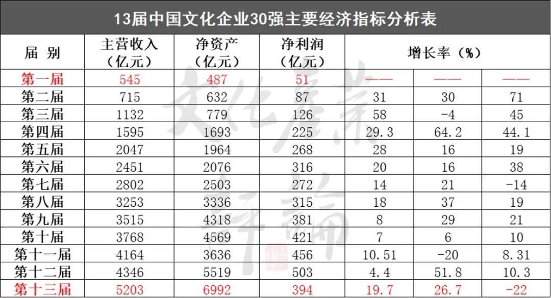 近日,光明日報社和經濟日報社在中宣部召開的文化高質量發展座談會上聯合發佈了第十三屆“全國文化企業30強”名單。本屆“30強”2020年度合計主營收入5203億元、淨資產6992億元、淨利潤394億元,主營業務收入和淨資產均創歷史新高,分別比上屆“30強”增長19.7%和26.7%,且主營業務收入首次突破5000億元大關,淨資產首次突破6000億元大關。同時,也標誌着中國文化產業正向高質量發展階段穩健邁進。