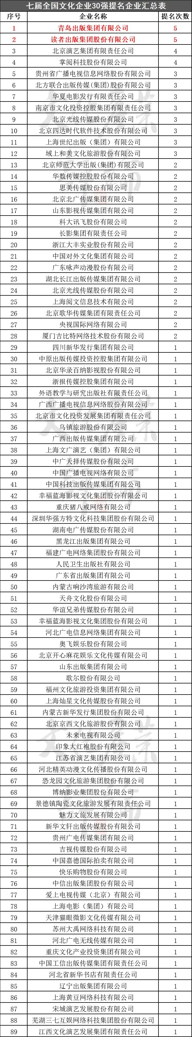 **五是蓄能待發強後勁。**文化產業發展不僅需要“文化航母”的引領,也需要“文化戰艦”的護航。為鼓勵成長性和創新性文化企業發展,主辦方自2015年第七屆開始專門設置“30強提名”企業,經過7年的持續推動,截至本屆累計有89家文化企業入選“30強提名”。其中,5次入選提名名單的企業有2家,4次入圍提名的企業有2家,3次進入提名名單的企業有8家。表現最為搶眼的是先後5次入圍“30強提名”的青島出版集團和甘肅讀者出版集團,其發展後勁不容小覷,值得期待。