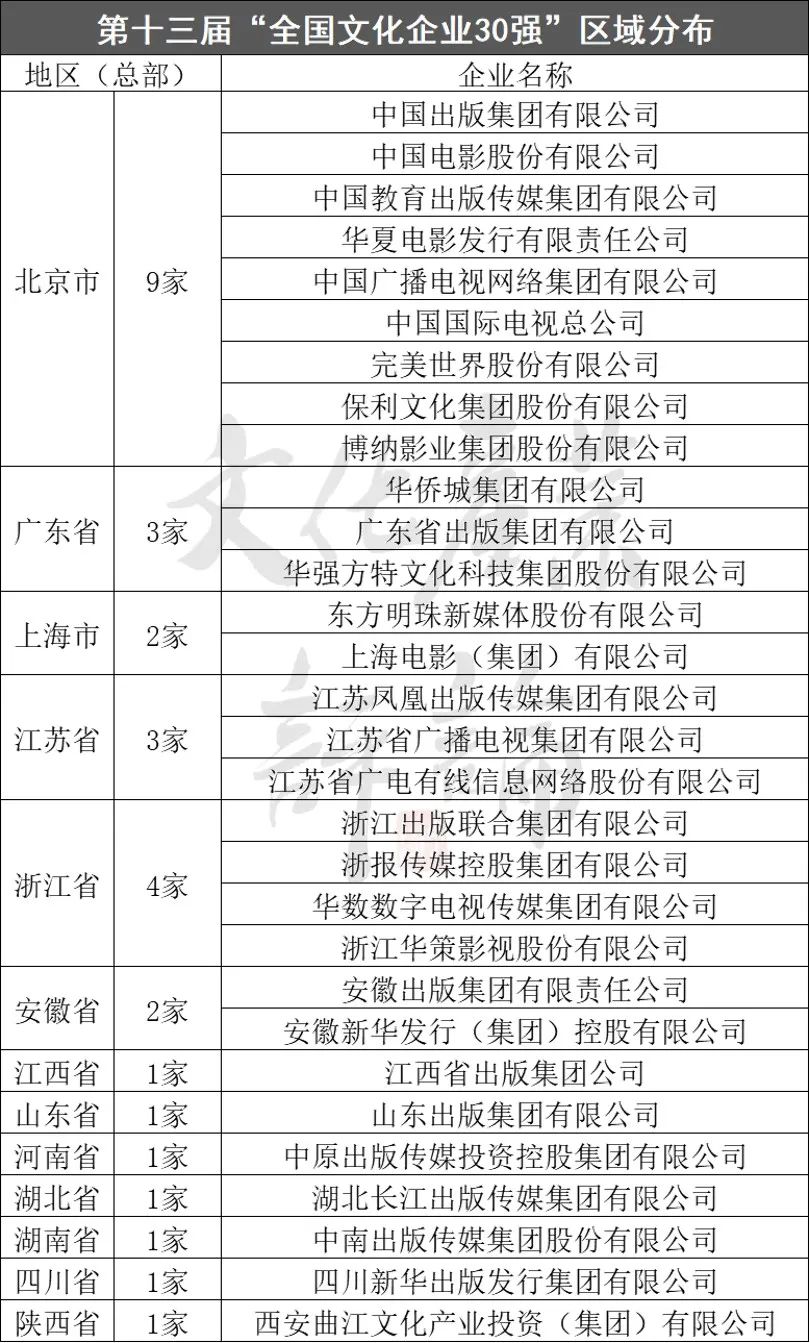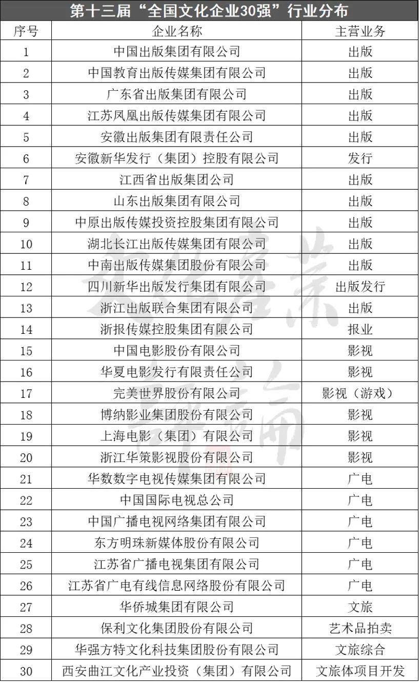 **從名單的行業分佈來看,**本屆“30強”粗略來看共涉及廣播影視、出版發行、文旅綜合及報業等四大類行業公司。其中,出版發行相關企業共13家上榜,廣播影視相關企業共有12家入圍,文旅相關企業有4家入選,報業行業僅有浙報傳媒控股集團有限公司1家獲選。