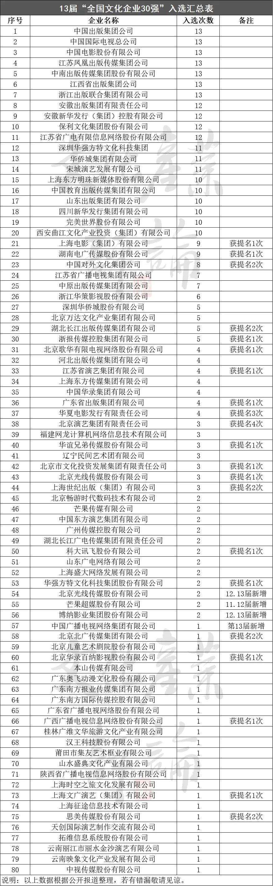 自2008年以來,光明日報社和經濟日報社連續13年發佈“中國文化企業30強”名單。盤點過往數據,截至目前13屆評選共有80家文化企業進入“30強”名單。其中,蟬聯13屆的企業有7家、上榜12屆的有4家、11次入選的有3家、10次入選的有6家,佔總榜單文化企業25%。