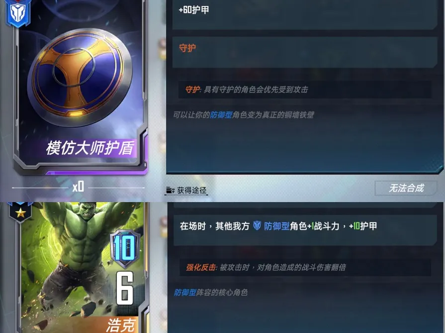 比如説我最近在玩的仙宮防禦打雷流,依靠防禦型角色不斷疊護甲觸發索爾蛙和奧丁的天雷特效,這套卡的缺點是前中期防禦型角色的初始護甲不高,很容易被直接秒掉,無法疊出護甲。而公共卡池中的綠色浩克與模仿大師護盾正好能彌補這個缺點:前者可以為所有防禦型角色增加護甲,後者可以為裝備者提供鉅額護甲以及嘲諷特效。