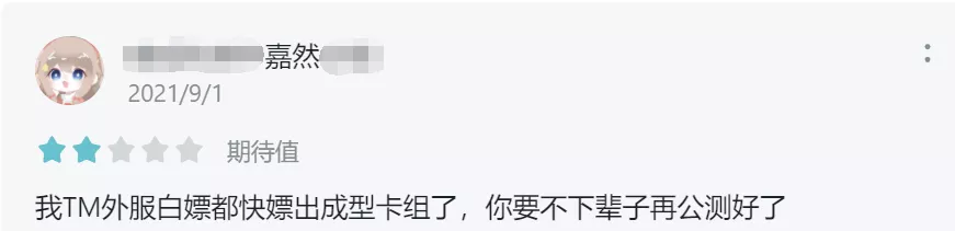 從目前的測試體驗來看,基本上不會因為不氪金而沒有能衝分的卡組——別忘了這遊戲還有所有人共用的21張固定卡池,並不是完全靠構築卡組的。玩家在TapTap上的評論也幾乎沒有提到氪金問題的,反而有下圖這種“我都要白嫖出成型卡組你還不公測”的差評。