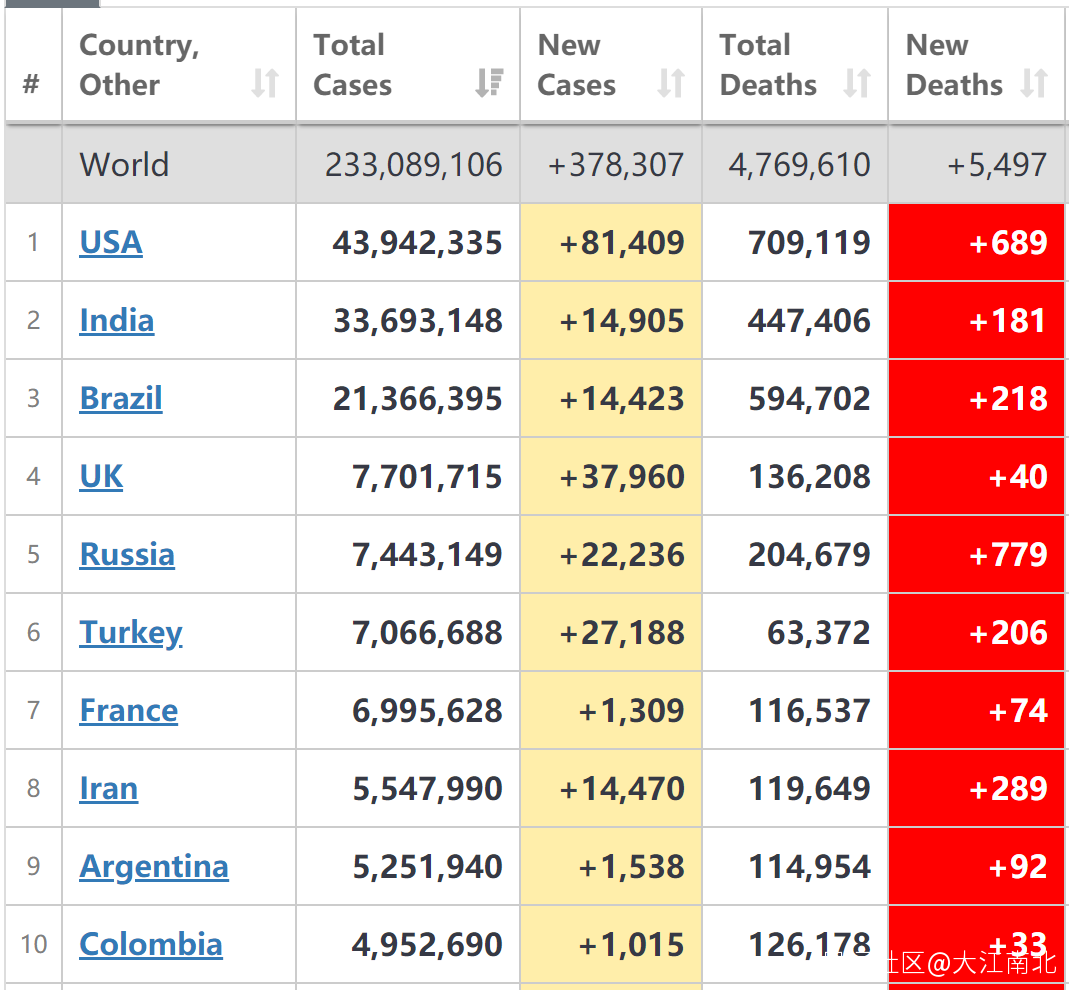 全球疫情第一大國美國新增確診81,409例;累計確診4394.23萬例;新增病亡689****例;累計病亡70.91萬例;美國這一波的疫情逐步收斂。