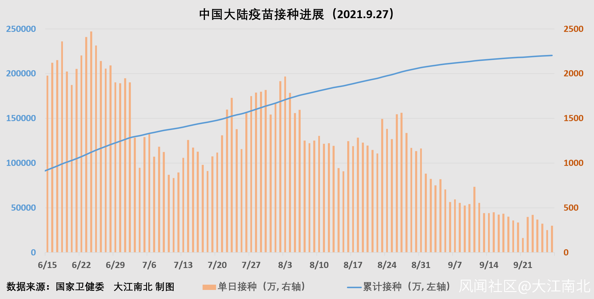 截止2021年9月27日,中國大陸累計接種新冠疫苗22.0319億劑,繼續位居全球第一位,佔全球累計接種劑數的35.7%;其中單日新增接種298萬劑,佔全球單日接種劑數的9.4%,再次降到10%以下。**中國每百人累計接種156.06劑,環比增加0.21劑,是美國的1.34**倍,位居世界主要大國之首。