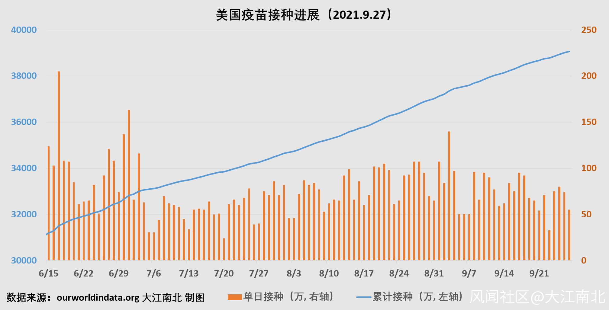 截止2021年9月27日,美國累計接種3.9066億劑,居全球第三位,其中單日新增接種55萬劑。美國每百人累計接種116.15劑,比中國低39.891劑,是中國的74.4%。