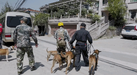 連續三天的搜救任務,兩條老年警犬疲憊不堪。