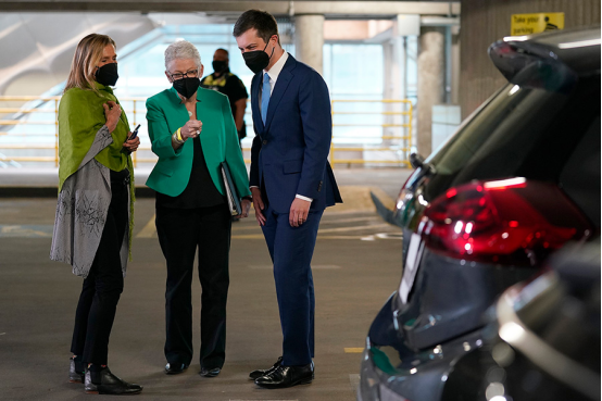 2021年4月22日,美國華盛頓,白宮氣候顧問吉娜·麥卡錫和美國交通部長皮特·布蒂吉格參觀當地電動汽車充電站。圖|人民視覺