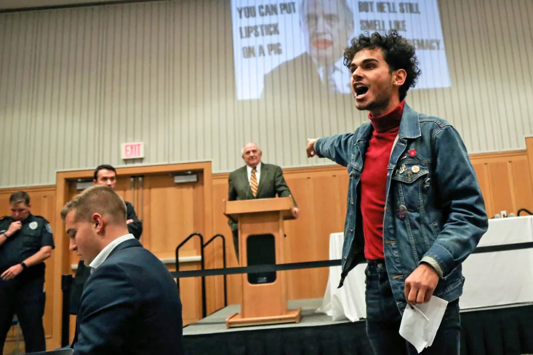 一名抗議者2017年在密歇根大學打斷了作家查爾斯·默裏(Charles Murray )的演講。Hunter Dyke/The Ann Arbor News, via Associated Press