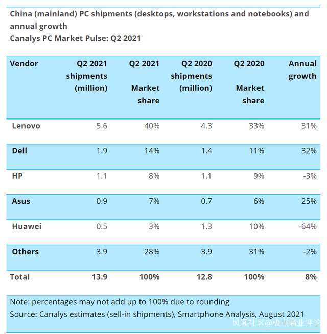 根據市場權威調研機構Canalys最新發布的數據,2021年第二季度國內PC市場,聯想同比增長31%,以560萬台出貨量佔據40%的市場份額;戴爾同比增長32%,衝到第二位;惠普、華碩位列第三和第四——華為排在第五位,出貨量僅為50萬台,同比大降64%。