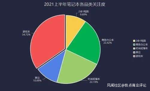 根據Gartner數據,2021年上半年筆記本各品類關注度中,遊戲本依然最高,整體達到34.72%,商務本與輕薄本基本持平,分別為22.42%和22.19%,2合1電腦關注度為9.69%。