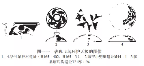 鳥的形象在中國史前時代廣泛流行,最通常的解釋是託負太陽的陽鳥 。廟底溝類型寫實鳥紋有些背上有圓點,被認為是金烏負日的寫實表現(圖一一:1) 。筆者曾提出鳥在中國史前時代與天極觀念密切相關,天極的運轉被認為需要神鳥的維護 。崧澤文化器蓋上常有雕刻或繪製的飛鳥環護天極圖像,如海寧小兜裏遺址 M44:1豆蓋倒置如天體模型,繪製6個圖案化的鳥首,圍繞代表天極的蓋柄旋轉(圖一一:2)。廟底溝類型彩陶器蓋上有類似圖像。廟底溝T21⑨:94器蓋頂部繪有弧線三角加圓點表現的羣鳥環繞有垂弧紋的中心的圖像(圖一一:3)。泉護村H165:3器蓋頂部為與段家莊H3:8類似的圖像,表現的是更復雜的鳥魚組合和羣鳥環繞中心蓋柄飛翔的場面(圖一一:4)。不管是託負太陽還是維護天極,都可以推測鳥在廟底溝社會的宇宙觀中也扮演了重要角色。