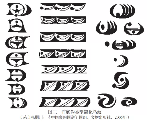 廟底溝時期彩陶的一個突出特徵是寫實及抽象鳥紋的盛行。石興邦在上世紀六十年代即提出半坡時期重魚紋,廟底溝時期重鳥紋 。張朋川對廟底溝類型鳥紋進行了全面分析,不僅對寫實鳥紋進行了分類,還正確指出三類簡化鳥紋:一是經常出現在圓形空白內的弧線三角加圓點紋、弧線三角加圓點加弧線或直線紋、直線加圓點紋;二是所謂“西陰紋” 或“垂弧紋” 內的圓點加弧線或直線紋;三是圓點加勾弧紋(圖三)。