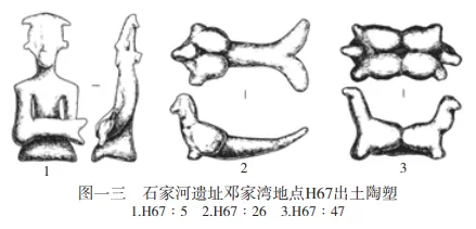 天門石家河遺址鄧家灣地點石家河文化遺存中有大量陶塑人物和動物形象 ,其中有坐姿人抱魚的形象9件(圖一三:1),被認為是對以魚獻祭場面的描繪 。其他解讀包括祈求生育和豐產 、捕撈成功 、借魚通靈 和奏魚形樂器等 。鄧家灣還同時出土“分叉長尾鳥”陶塑18件,長尾分叉如魚尾,可以稱作魚尾鳥(圖一三:2),正是魚鳥轉化狀態的生動描繪。其中還包括連體雙鳥相背而飛的形象,與廟底溝類型相關彩陶圖像如出一轍(圖一三:3)。尤其值得注意的是,9件人抱魚陶塑中的8件和18件魚尾鳥陶塑中的13件均出自灰坑H67中,表明二者有密切關係。綜合這些現象,我們推測這些陶塑應該是與魚鳥化生有關的儀式活動的遺物。抱魚者應為巫師,幫助鳥從魚體內的誕生;魚尾鳥則是對成功轉生的描繪。這些遺物並未使用玉等高等級材料,製作也比較粗糙,數量較多,與社會上層的聯繫並不明確,似乎普通民眾和一般巫師也可以舉行相關儀式。