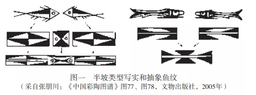 自仰韶文化發現以來,其獨具特徵的彩陶圖像即為研究的熱點。西安半坡遺址發掘獲得豐富的半坡類型彩陶圖像資料,1963年出版的發掘報告對半坡風格魚紋進行了開創性的詳細研究,確立了寫實魚紋和由直線三角、弧線三角等元素組成的抽象魚紋為半坡彩陶最重要主題的基本認識 。張朋川此後又有系統的歸納分析,深化了對此主題的理解(圖一) 。