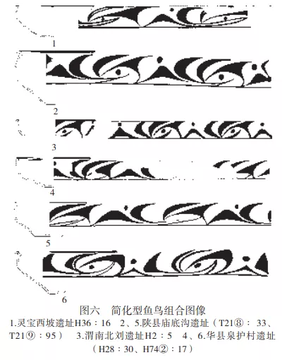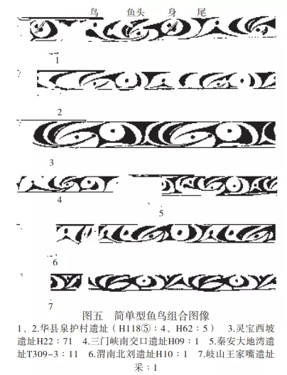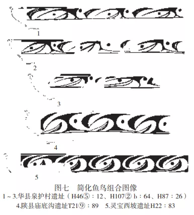 華縣泉護村遺址廟底溝類型彩陶中,多單元魚鳥組合圖像為重要主題 。H107②b:65盆紋飾帶被三組斜弧線分為三部分,較寬的兩部分內為相同的魚鳥組合,左端為對頂弧線三角加圓點式對鳥,魚頭為弧邊長勾“工”字形,內有勾弧+圓點式鳥紋;魚身第一單元為弧線三角加弧線加上下圓點式對鳥;第二單元為雙弧線三角加圓點式對鳥,後一組對頂弧線三角對鳥上部的弧線三角為魚尾。較窄部分有相同的魚鳥組合圖像,只是省略了魚身的第二單元(圖四:3)。同灰坑的H107③a:82斂口罐紋飾帶同樣被三組斜弧線分為三部分,各有一個魚鳥組合圖像。其中一部分較寬,左端為對頂弧線三角加圓點對鳥,魚頭為弧邊長勾“工”字形,內有勾弧加圓點式鳥紋;魚身第一單元為勾弧加圓點式鳥紋,第二單元為對勾弧加圓點式對鳥紋,魚尾為後一組對頂弧線三角對鳥紋的上部。另兩個較短部分圖像相同,為較寬魚鳥組合省略魚身的第二單元(圖四:4)。