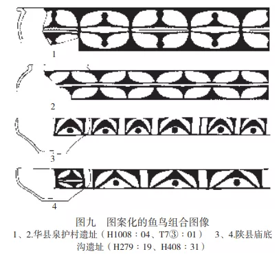 新安槐林遺址H4:3魚前飛鳥的身體呈規範的倒V形 ,圓點上有雙弧線紋;魚身部分圖案化近圓形,後部仍然可以看出弧線三角形魚尾,魚體內為直線加弧線三角加圓點式鳥紋(圖八:1)。廟底溝遺址H278:15盆表現鳥身的弧線三角與表現魚頭輪廓的弧線合二為一,近圓形的魚身內為平行直線加雙圓點式對鳥紋,但仍然有獨立的弧線三角形魚尾,上邊平直,下端纖細(圖八:2)。夏縣西陰村遺址缽同樣是鳥身的弧線三角與魚頭輪廓合二為一 ,魚尾也與魚身一體,形成以近圓形魚身為中心的兩個對稱弧線三角,但魚尾的弧線三角仍保留着上邊平直、下端纖細的特徵(圖八:3)。
